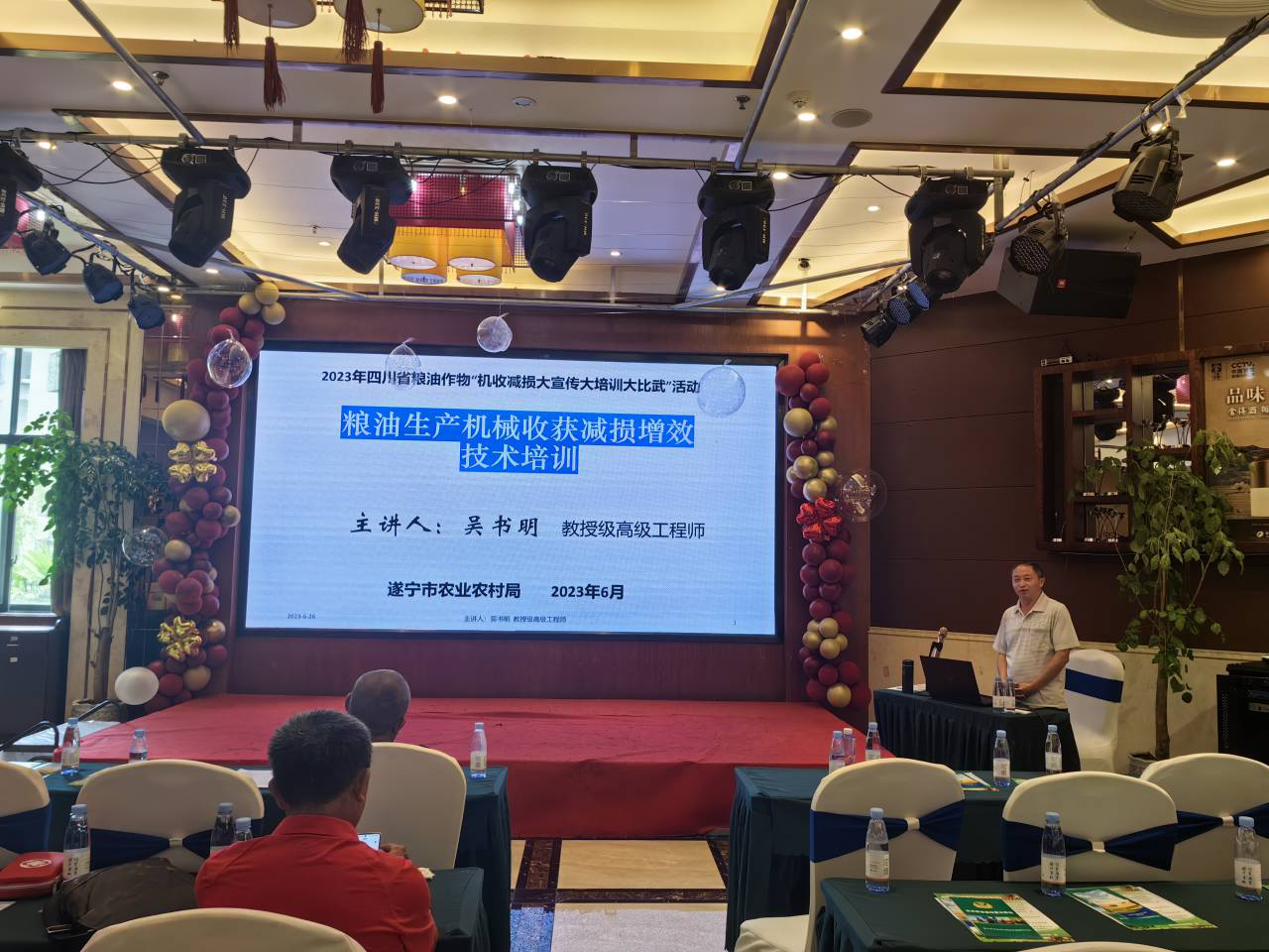 在培训室内,发放《农机安全生产重大事故隐患判定标准》、《变形拖拉机相关政策知识要点》、《2023年遂宁市水稻机械化收获减损技术明白纸》、《2023年遂宁市玉米机械化收获减损技术明白纸》、《2023年遂宁市大豆机械化收获减损技术明白纸》、《大豆玉米带状复合种植技术指导手册》等宣传资料;市农机监理所胡金玉同志从乡镇管理人员、农机合作社等服务组织以及农机驾驶员的角度,讲解了农机安全生产管理工作要点;吴书明教授级高级工程师作《粮油机收减损增效技术》专题报告,详细讲解水稻、玉米、大豆、小麦、油菜作物机械化减损的背景与要求、作业前准备、适宜收获时间、机收作业质量标准、减损增效技术措施作业要求、关键技巧等技术问题,指导农机手排查故障、调整作业参数,并主动询问作业期间遇到的困难和问题并尽全力予以协助解决。“田间日农机科普+安全行”活动,为粮油机械化科技的顺利推广提供良好技术支持,让党徽在百姓心中闪闪发光。
