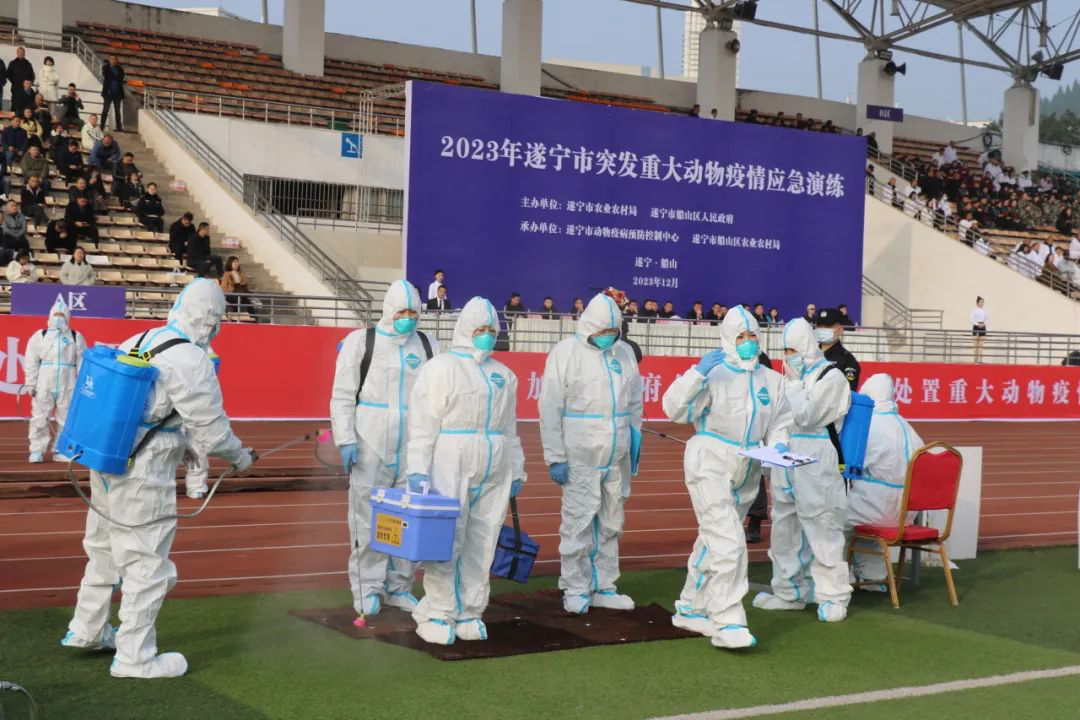12月7日,2023遂宁市突发重大动物疫情应急处置演练在四川职业技术学院举行。船山区农业农村局、区公安局(特警)、区市场监管局、区卫健局等相关人员参加演练,四川省、遂宁市及各区县乡镇相关单位领导、有关负责人观摩演练活动。