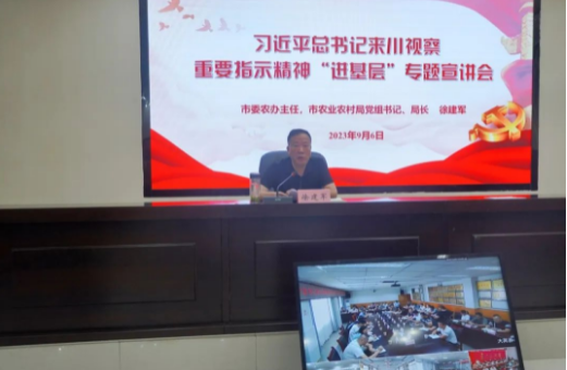 按照市委的安排部署,9月6日上午,遂宁市农业农村局召开习近平总书记来川视察重要指示精神“进基层”专题宣讲会,市委农办主任,市农业农村局党组书记、局长徐建军结合全市“三农”重点工作对指示精神进行深入宣讲和解读。会议主会场设在遂宁市农业农村局二楼会议室,各县(市、区)农业农村局设分会场。