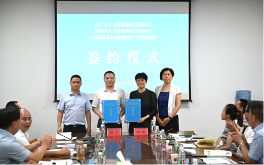 7月15日,潼南区人社局党组书记、局长戴红丽带领局党组成员、部分局属单位和机关科室负责人等一行18人来遂考察学习,签订遂潼社会保险基金风险防控工作联动协议。市人力资源社会保障局党组成员、副局长杜胜及市社保局三级调研员杜学陪同考察。