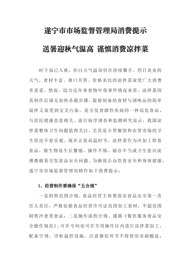 遂宁市市场监督管理局消费提示 送暑迎秋气温高 谨慎消费凉拌菜