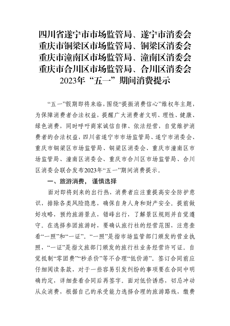 四川省遂宁市市场监管局、遂宁市消委会 重庆市铜梁区市场监管局、铜梁区消委会 重庆市潼南区市场监管局、潼南区消委会 重庆市合川区市场监管局、合川区消委会 2023年“五一”期间消费提示