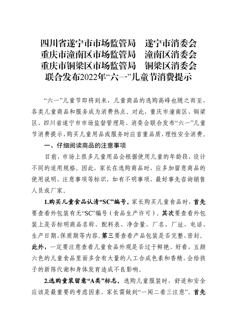 四川省遂宁市市场监管局 遂宁市消委会 重庆市潼南区市场监管局 潼南区消委会 重庆市铜梁区市场监管局 铜梁区消委会 联合发布2022年“六一”儿童节消费提示