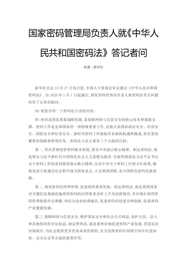 国家密码管理局负责人就《中华人民共和国密码法》答记者问