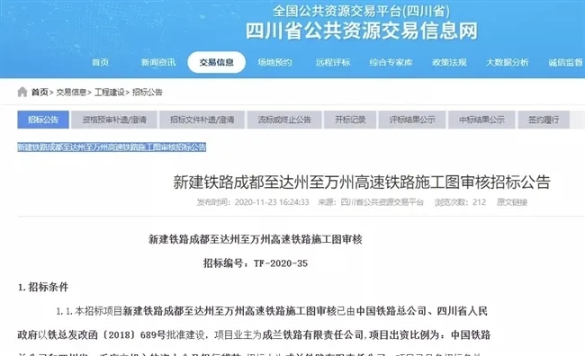 11月13日,成达万高铁可研报告获国家发展改革委批复;11月18日,成达万高铁华蓥山隧道段开始施工招标,计划于今年12月20日开工;现在全线两个标段开启施工图审核招标,意味着工程前期工作又向前推进了一步,为项目招标和全线开工建设奠定了基础。