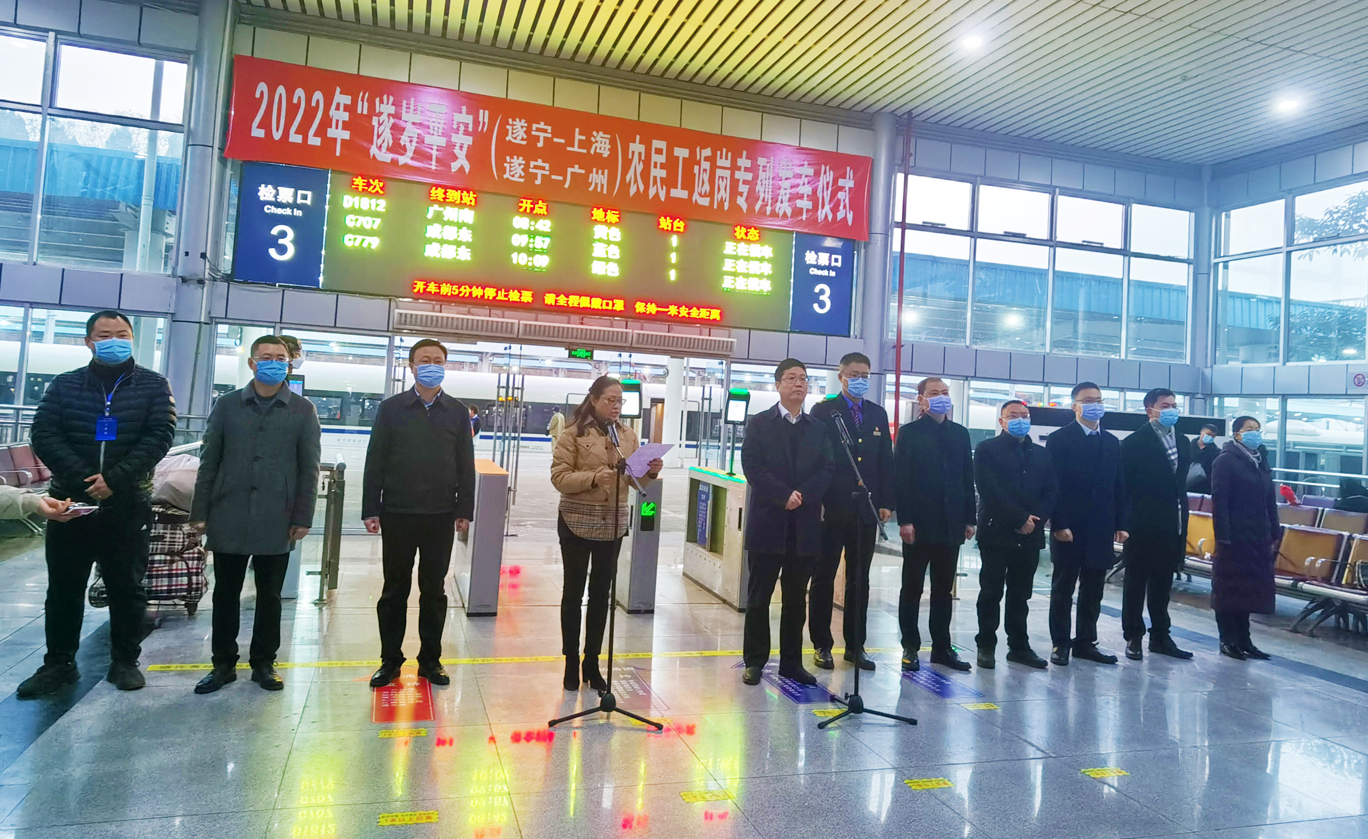 2月11日8:00,D638次遂宁—上海虹桥、D1812次遂宁—广州南“遂岁平安”农民工返岗专列在遂宁火车站举行了发车仪式,561名和764名遂宁籍农民工分别踏上前往上海、广东返岗复工征程,两趟列车将分别于今日22:13、18:00抵达目的地。