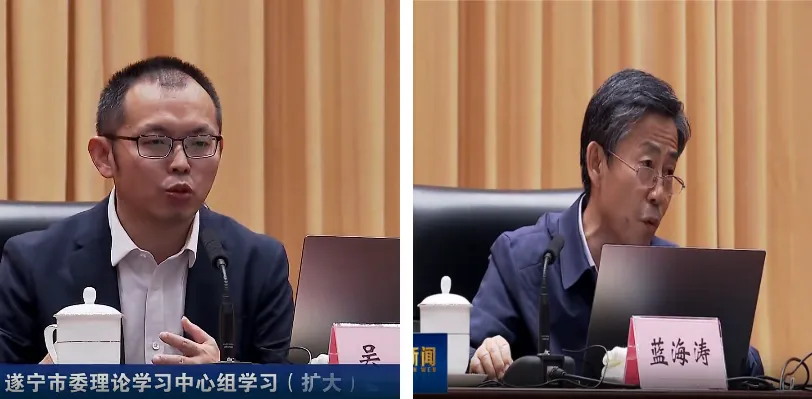 调研组应邀参加了市委理论学习中心组学习(扩大)会议。吴萨副所长、蓝海涛副所长分别围绕“‘十五五’规划编制理论方法和思考”“新时代新征程构建现代化产业体系若干问题思考”2项主题,从宏观视野和遂宁实际出发,深入开展理论阐释、形势分析、思路谋划,为全市领导干部作专题辅导。