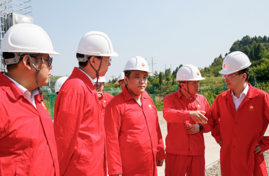 图为国际绿色经济协会(IGEA)执行会长邓继海(正中)在磨溪区块龙王庙组气藏项目建设生产现场视察