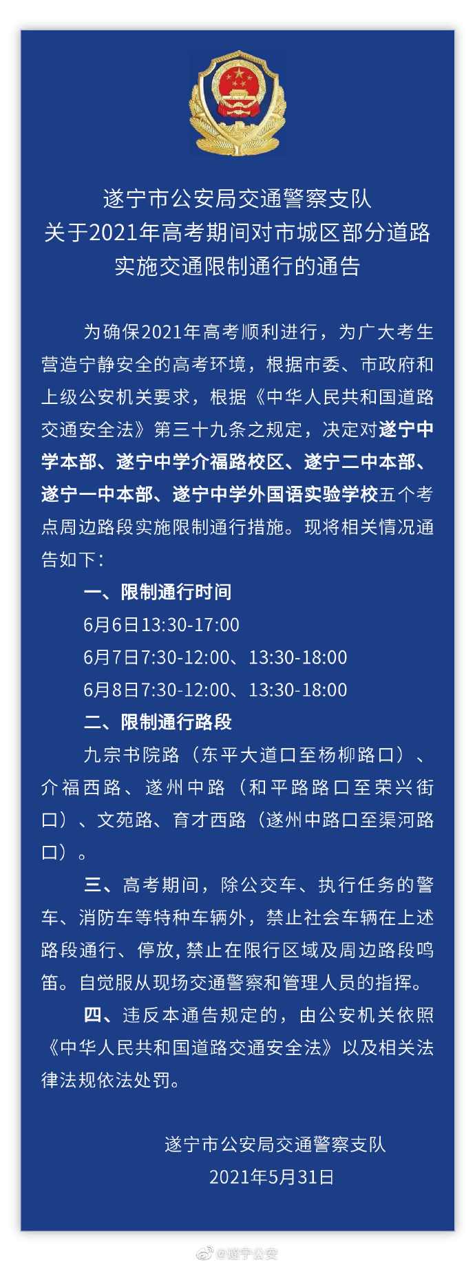 遂宁市公安局交通警察支队关于2021年高考期间对市城区部分道路实施交通限制通行的通告