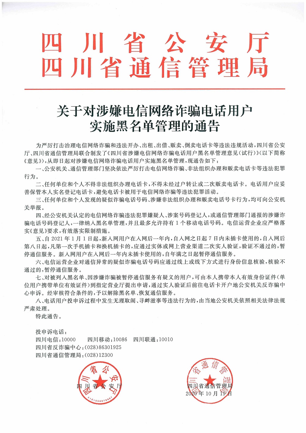 关于对涉嫌电信网络诈骗电话用户实施黑名单管理的通告
