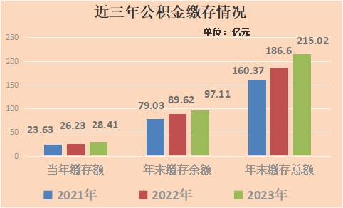 2023年,市公积金中心深入实地调研,召集各大行业协会座谈,积极开展常态化缴存扩面工作,持续推进机关事业单位缴存基数规范,抓细欠缴催收,推进归集扩面。全市实缴单位2860个,实缴人数15.6万人,同比分别增长7.00%、2.85%;缴存额28.41亿元,同比增长8.30%。截止2023年末,缴存总额215.02亿元,缴存余额97.11亿,分别增长15.23%、8.36%,近几年来缴存金额保持持续增长态势。