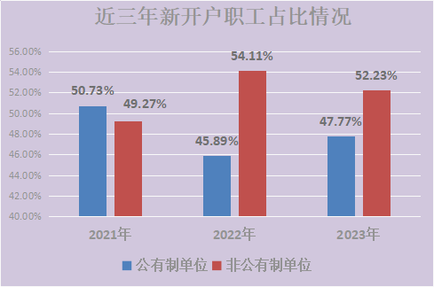 2023年,非公有制单位开户人数连续两年超过公有制单位,更多的非公有制单位职工权益得到保障。全市新开户单位339个,新开户职工3.06万人,新开户职工中,非公单位职工人数1.60万人,占新开户职工人数的52.23%。