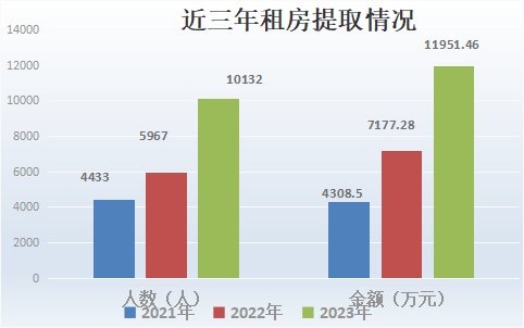 2023年,市公积金中心持续优化租房提取政策, 提高租房提取额度并可按月提取,缓解新市民、青年人“租不好房”的难题。全市租房1.01万人提取1.2亿元,同比分别增长77.82%,66.52%,租房提取金额占5.71%,高于全省整体水平。按月租房提取338人45.43万元。