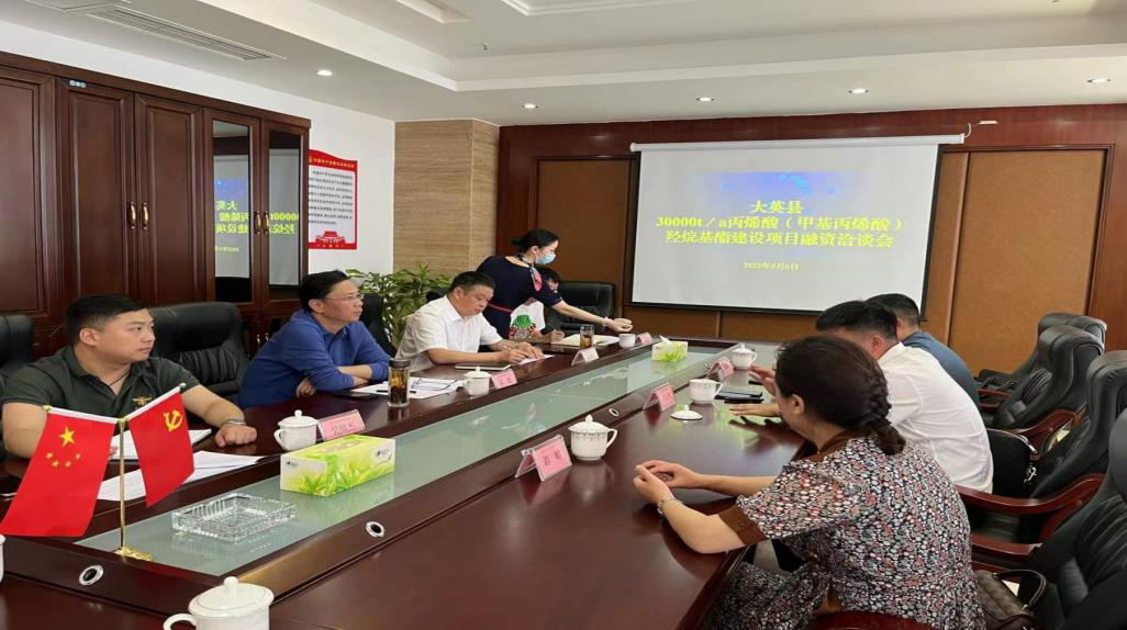 为贯彻落实《2022年全市56个新开工重大产业项目融资情况调度会议》精神,充分彰显国企担当,促进我市产业发展,发展产投集团积极对接10家市重大项目中有融资需求但暂未获得资金支持的企业。202256上午,公司组织急切需要资金支持的大英县30000t/a丙烯酸(甲基丙烯酸)羟烷基酯建设项目业主单位四川旌峰新材料有限公司进行融资洽谈。