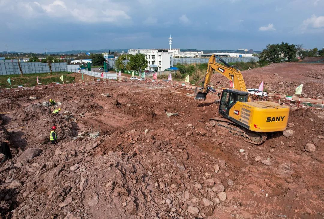 3月29日,在月星遂宁环球港建设项目现场,挖掘机、运输车辆来回穿梭,各种机械引擎轰鸣作响,50多名工人正紧锣密鼓地进行场平施工作业。