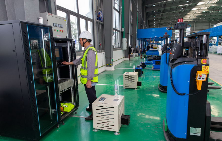 在四川蜀矿环锂科技有限公司年产10万吨废旧锂电池回收利用项目一期电池拆解车间,AGV转运车、机器人、CNC加工中心等智能设备正在高效运转。