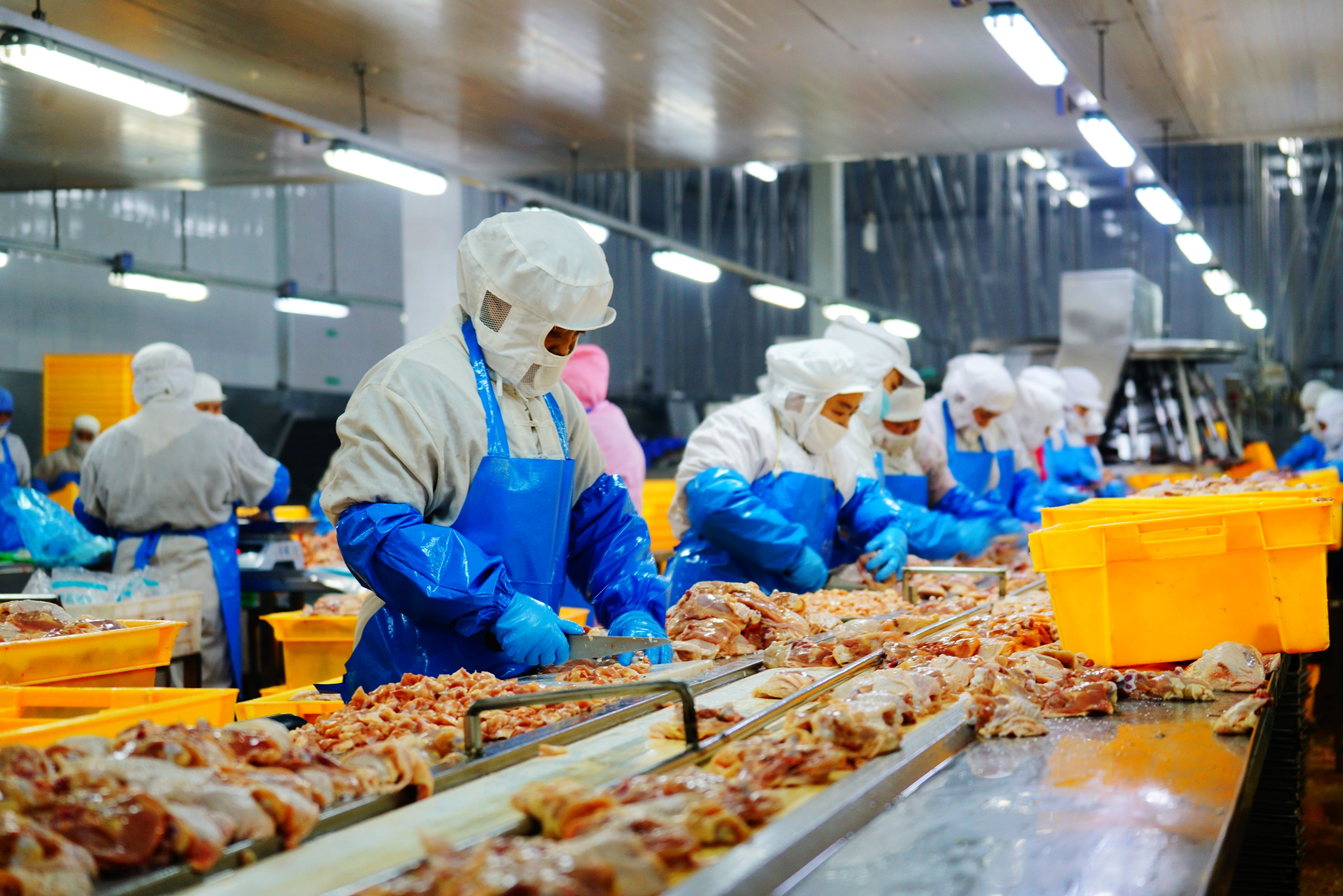 近日,记者在正大食品遂宁有限公司白羽肉鸡屠宰加工厂生产车间看到,一只只新鲜的整鸡正悬挂在传输链上,沿着条条生产线向前滑动。“全副武装”的工人在各条生产线上忙碌,完成分割、切块、包装……鸡腿、鸡胸肉、鸡翅等产品不断快速下线,准备送上千家万户的餐桌。
