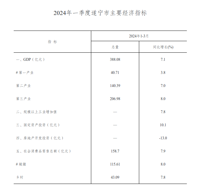 根据地区生产总值统一核算结果,2024年一季度遂宁地区生产总值388.08亿元,按可比价格计算,同比增长7.1%。其中,第一产业增加值40.71亿元,增长3.8%;第二产业增加值140.39亿元,增长7.0%;第三产业增加值206.98亿元,增长8.0%。