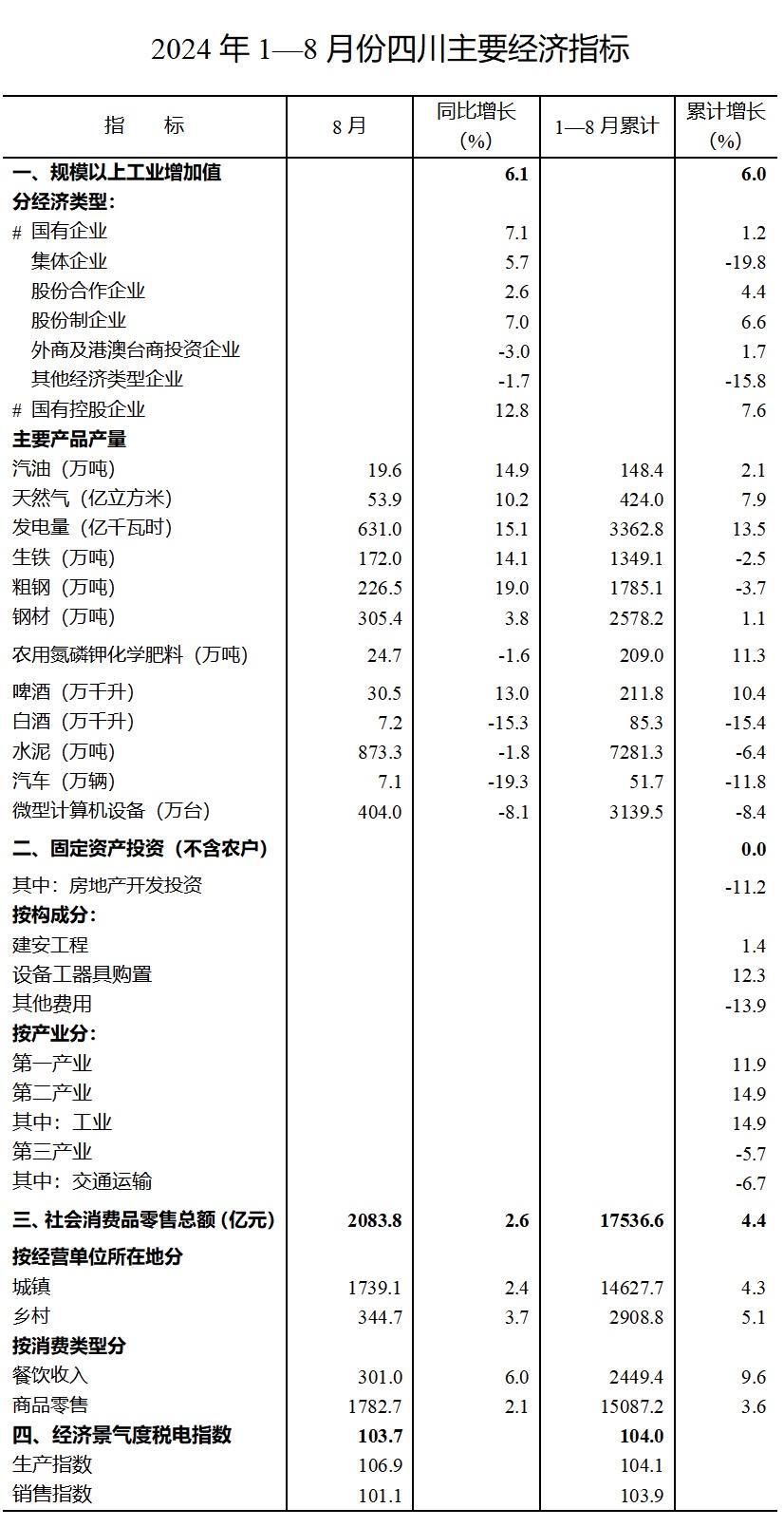 近日,四川省统计局发布2024年1至8月四川省国民经济主要指标数据。数据显示,1至8月,全省规模以上工业增加值同比增长6.0%,增速比全国高0.2个百分点;全省实现社会消费品零售总额17536.6亿元,同比增长4.4%,增速比全国高1个百分点。