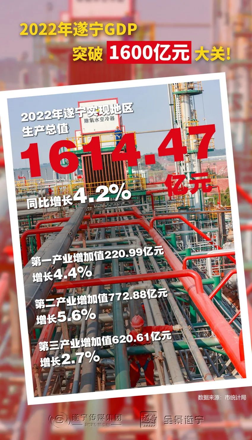 1月19日,市统计局发布数据显示:2022年遂宁实现地区生产总值1614.47亿元,同比增长4.2%。其中,第一产业增加值220.99亿元,增长4.4%;第二产业增加值772.88亿元,增长5.6%;第三产业增加值620.61亿元,增长2.7%。