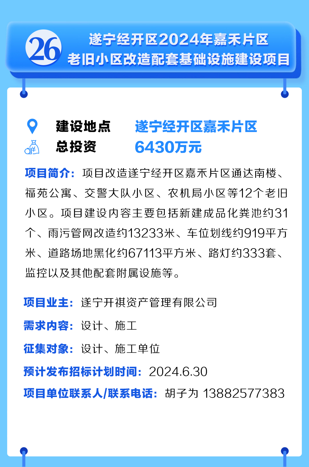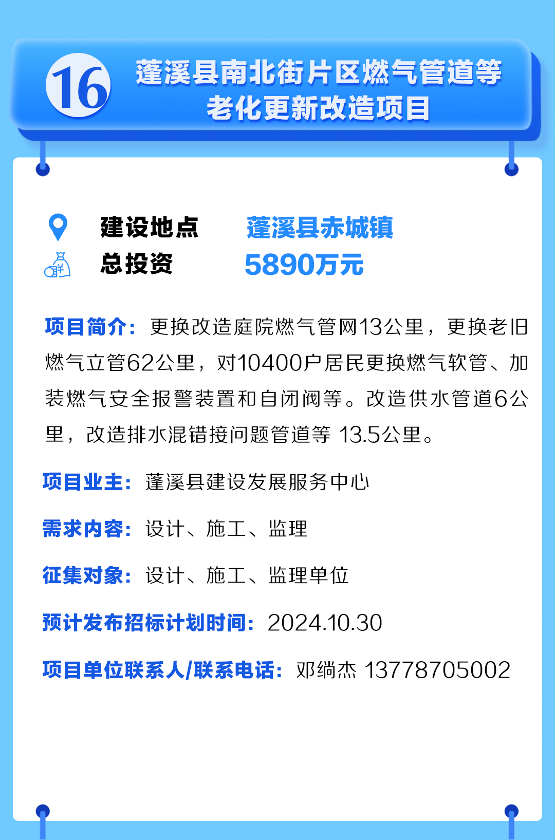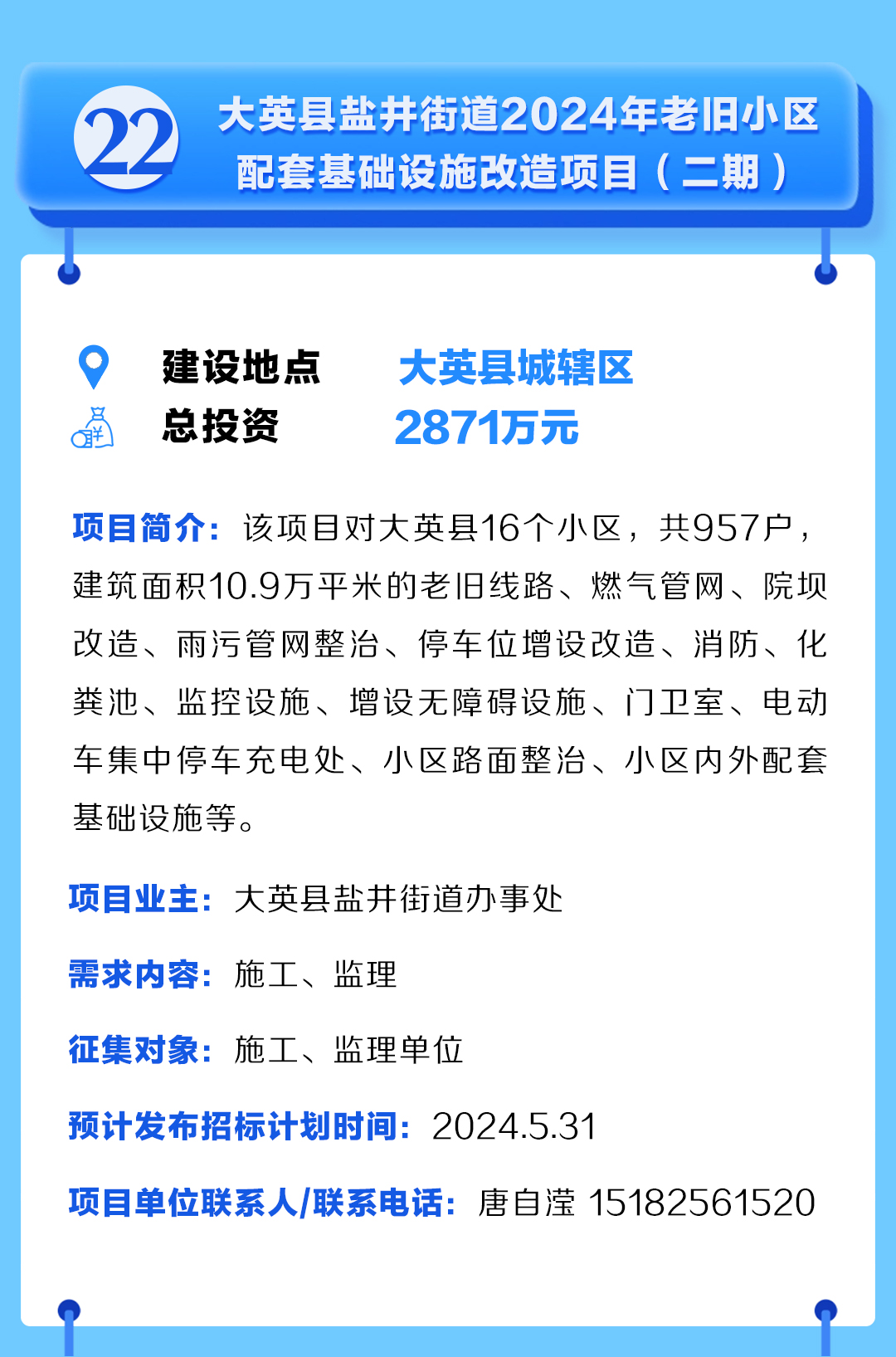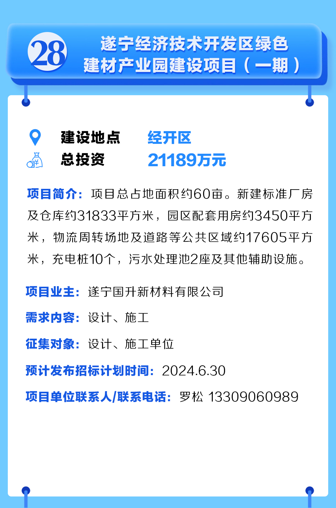 本批发布投资项目服务需求信息共计29条、项目计划总投资28.85亿元。其中国家重大工程和补短板领域项目27条、总投资25.04亿元,重点产业链供应链领域项目1条、总投资2.12亿元,完全使用者付费的特许经营领域项目1条、总投资1.69亿元。诚邀有意者广泛参与。