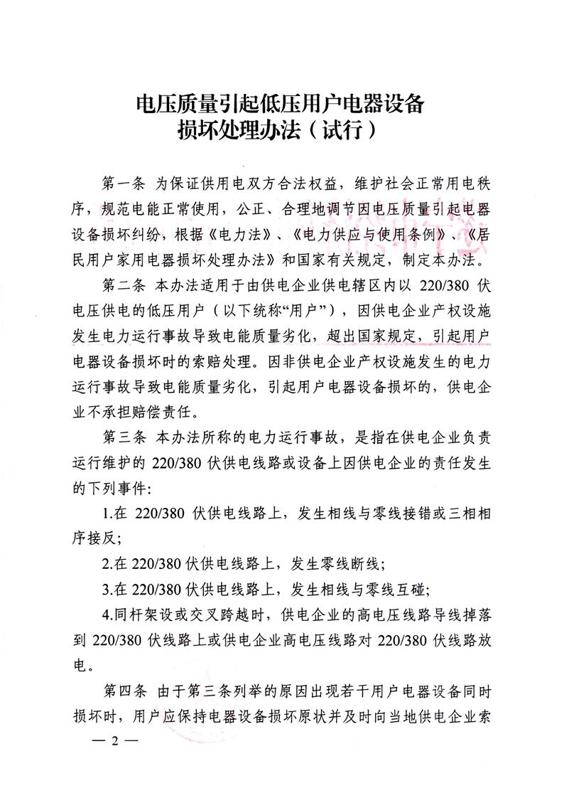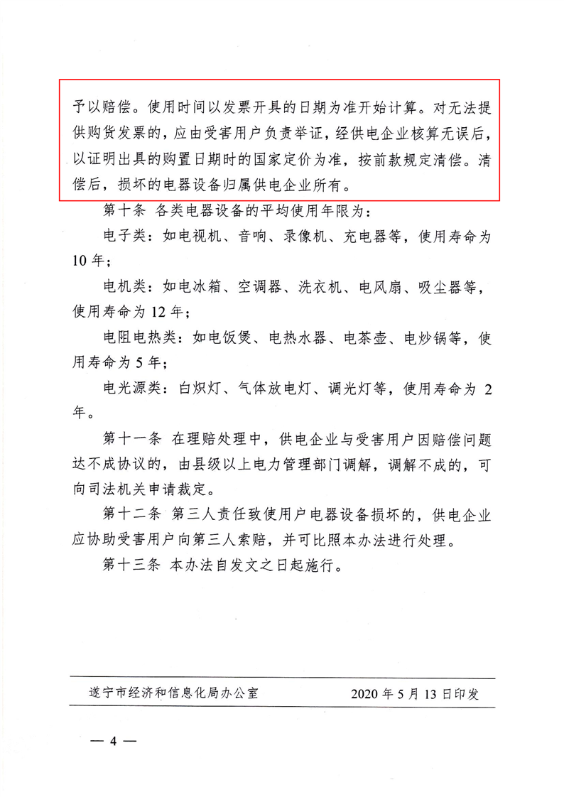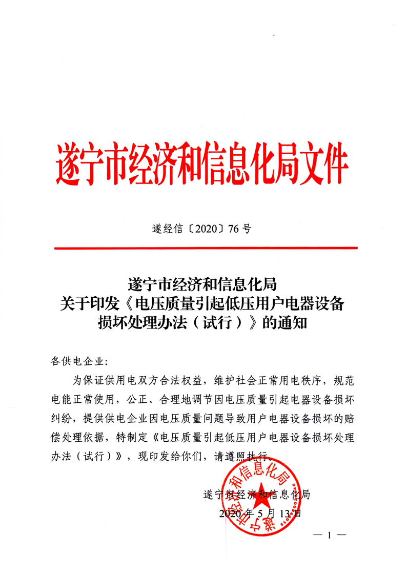 遂宁市经济和信息化局关于印发《电压质量引起低压用户电器设备损坏处理办法(试行)》的通知