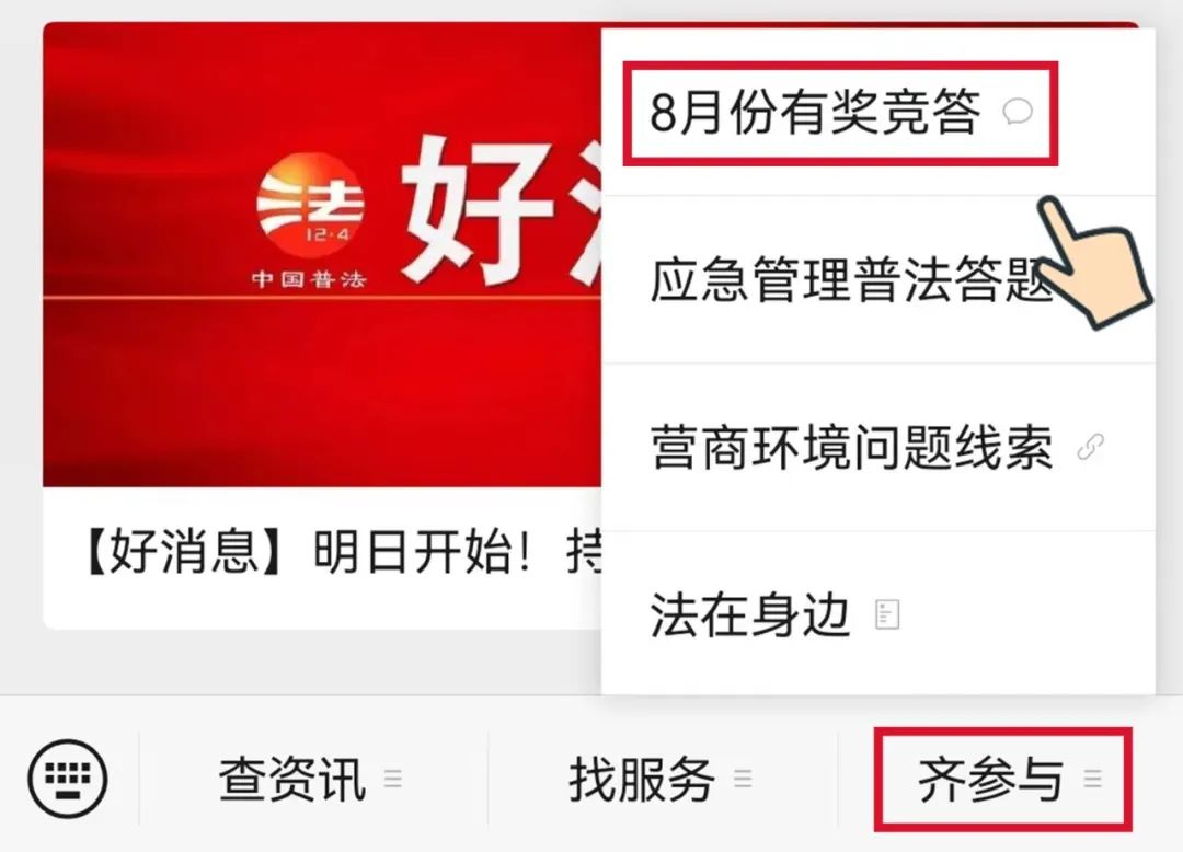 答题办法:关注中国普法微信公众号,在手机下方子菜单“齐参与”中找到“8月份有奖竞答”进入答题页面即可答题。