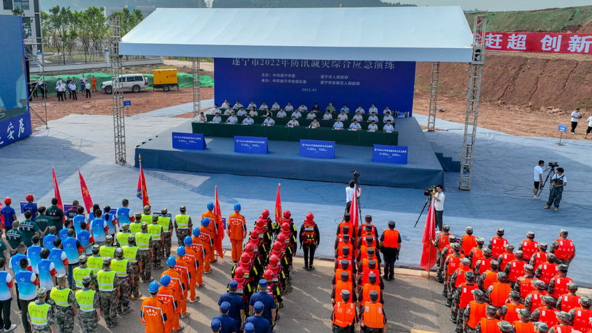 为深入学习贯彻习近平总书记关于防汛救灾工作的重要指示批示精神,认真落实党中央、国务院和省委、省政府关于防汛减灾工作总体部署,7月26日上午,我市在安居区龙岗坝举行2022年防汛减灾综合应急演练,对全市防汛救灾应对能力进行全面检验,对做好2022年防汛救灾工作进行再动员、再部署。市委书记李江,市委副书记、市长、市防汛抗旱指挥部总指挥刘会英参加演练。