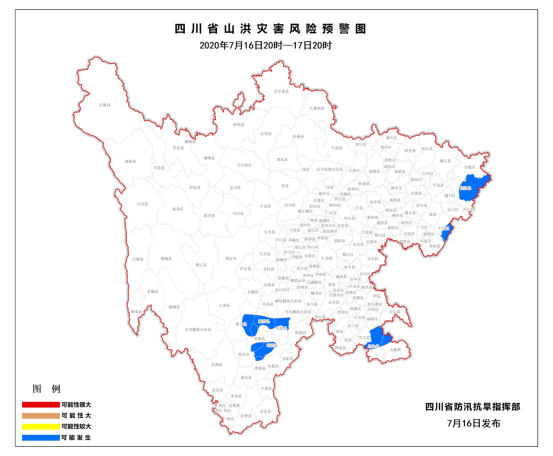 2020年7月16日18时,四川省防指发布山洪灾害蓝色预警。预计,2020年7月16日20时至17日20时,越西、美姑、冕宁、喜德、昭觉、叙永、古蔺、宣汉、大竹等县(市、区)可能发生山洪灾害。