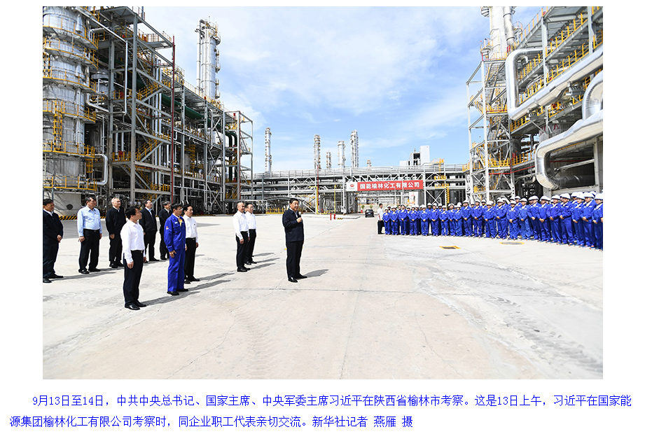 13日上午,习近平首先来到国家能源集团榆林化工有限公司,了解循环经济煤炭综合利用项目规划建设运行情况。在中心控制室,习近平观看项目产品展示,对企业坚持创新发展,坚持安全、稳定、清洁运行的做法表示肯定。随后,习近平到年产40万吨乙二醇项目现场察看,询问煤化工深度发展有关情况,同企业职工代表亲切交流。他强调,榆林是国家重要能源基地,为国家经济社会发展作出了重要贡献。煤炭作为我国主体能源,要按照绿色低碳的发展方向,对标实现碳达峰、碳中和目标任务,立足国情、控制总量、兜住底线,有序减量替代,推进煤炭消费转型升级。煤化工产业潜力巨大、大有前途,要提高煤炭作为化工原料的综合利用效能,促进煤化工产业高端化、多元化、低碳化发展,把加强科技创新作为最紧迫任务,加快关键核心技术攻关,积极发展煤基特种燃料、煤基生物可降解材料等。
