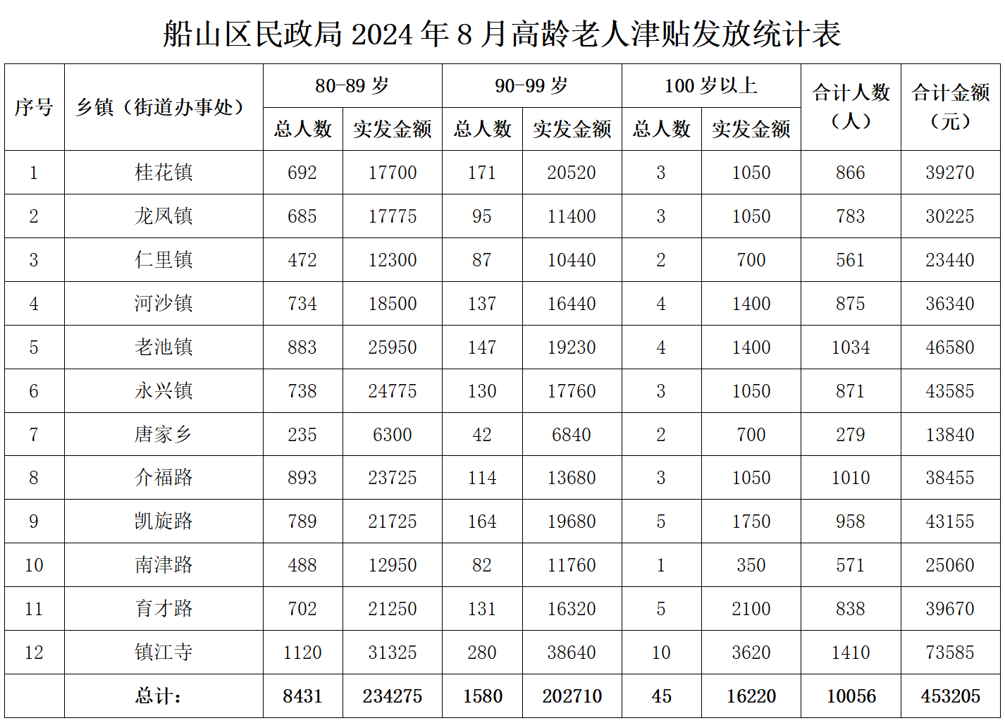2024年8月,全区共发放老年人高龄津贴10056人,共发放老年人高龄津贴45.3205万元。