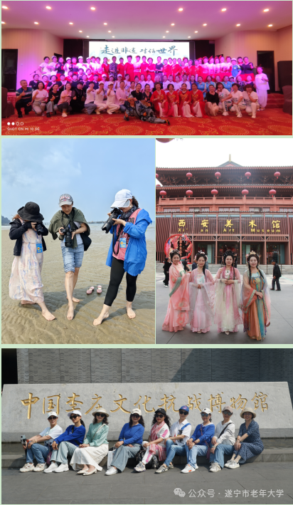 念好“游 学 养”三字经。学校艺术团舞蹈队、普通话班、电吹管班、声乐班、交谊舞班等学员到中共中央西北局纪念馆、李庄文化抗战博物馆、毛泽东旧居、杨闇公故居、陈毅故居等红色文化景点,走进红色基地,汲取奋进力量。学员们缅怀革命先烈、传承红色基因、铭记血肉历史,荡漾在脑海的是无限的革命精神和伟大建党精神,更加懂得和珍惜现在的美好幸福生活。时装班、非洲鼓班、瑜伽班、民族舞班、芭蕾形体班等学员到千年古都西安、万仙山景区、四川大渡河峡谷、黄龙溪古镇、观音湖湿地公园等历史人文景点,品读历史人文,追溯灿烂记忆。学员们领略历史风采,探访古老故事,拓宽人生视野,体会中华民族历史文化的伟大灿烂,感受新时代祖国日新月异的飞速发展。诗词班、书画班、声乐班、慈音寺分校等学员通过到安居区海龙凯歌风景区、蓬溪县牛角沟村等四川省养心文化老年游学基地寻访乡村振兴,邂逅生态新貌,了解沼气技术、体验四川养心文化老年游学基地的魅力。摄影班学员到黑龙滩风景区等地开展摄影交流等活动,学员们在游中有所学、学中有所行,行中有所思,赋予老年大学“游学养”的实践意义。