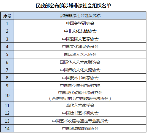 近年来,民政部和各地民政部门持续开展打击整治非法社会组织工作,中国文联也积极发布维权预警,对文艺类的非法社会组织进行曝光。2021年1至8月,民政部已公布五批涉嫌非法社会组织名单、七批地方民政部门依法取缔的部分非法社会组织名单。为防止不明真相的文艺组织和文艺工作者上当受骗,我们将其中与文艺相关的96个非法社会组织进行了汇总整理,共涉及北京、河北、浙江等17个省市自治区。