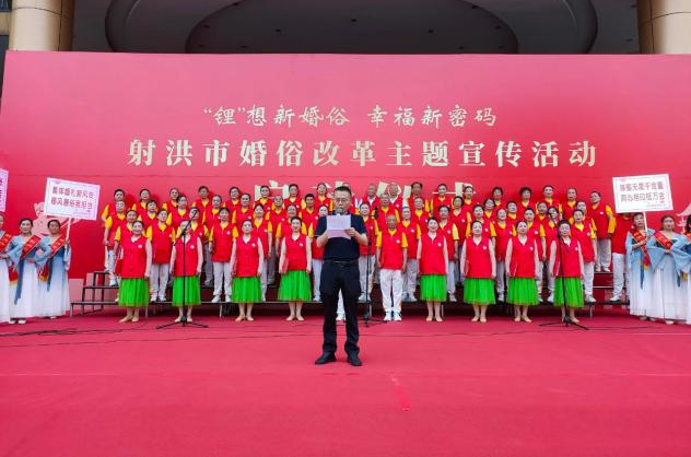 射洪市,在新世纪广场举办“‘锂’想新婚俗 幸福新密码”婚俗改革主题宣传活动。发出婚事新办简办倡议,倡导抵制高额彩礼、大操大办及低俗婚闹,20名志愿者现场向群众发放宣传资料2000余份。活动通过歌舞、快板、小品等文艺形式生动传播婚改理念,200余名群众参与婚姻登记法律法规知识互动问答。