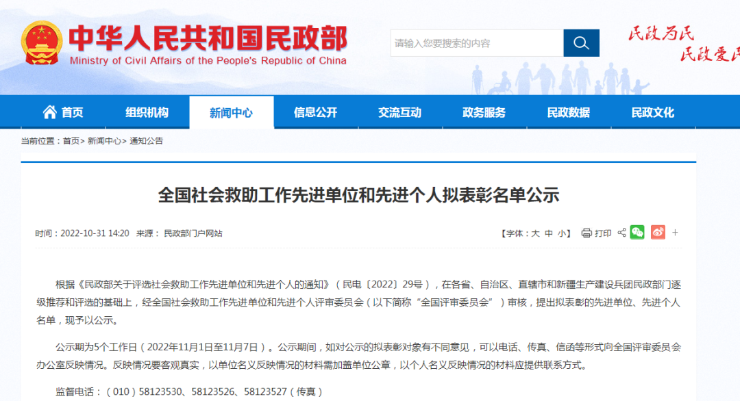 10月31,民政部对全国社会救助工作先进单位和先进个人拟表彰名单进行公示。
