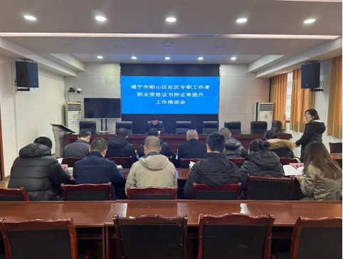 为切实做好我区社区专职工作者专业化职业化管理工作,加快打造一支政治坚定、业务精通、数量充足、结构合理、作风过硬、群众满意的城乡社区专职工作者队伍。根据《中共遂宁市委组织部 遂宁市民政局关于做好社区专职工作者职业资格证书持证率提升工作的通知》(遂船组通〔2024〕13号)文件精神,近日,船山区民政局召开社区专职工作者职业资格证书持证率提升工作会。