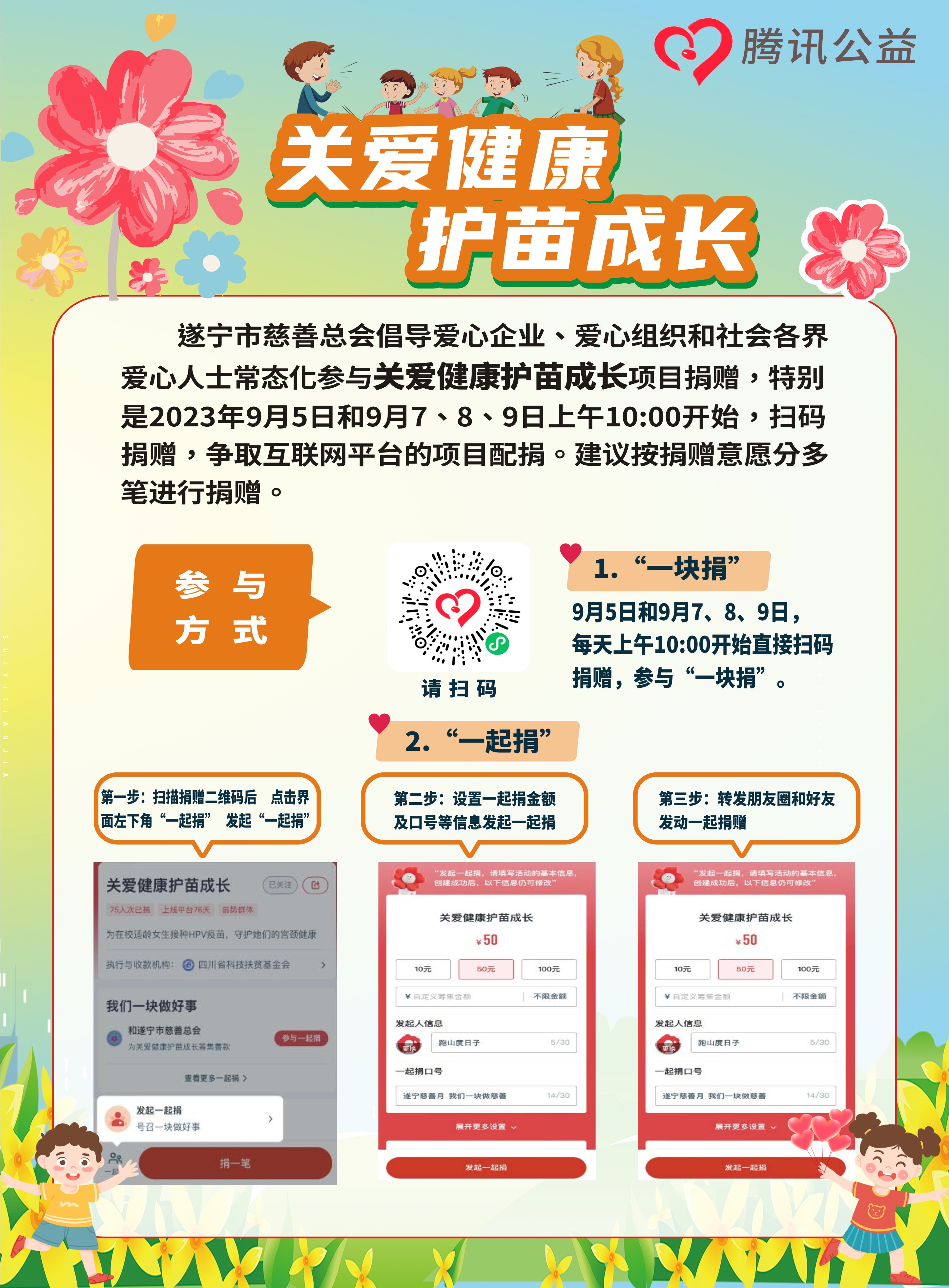 遂宁市慈善总会联合四川省科技扶贫基金会在腾讯公益平台上线了“关爱健康护苗成长”、“明亮相伴爱心课桌”等项目,现面向社会发布募捐倡议书并设置捐赠二维码,倡议社会各行业和各界爱心人士奉献爱心,常态化参与项目捐赠,特别是2023年9月5日和7、8、9日上午10:00开始,扫码捐赠,争取互联网平台的项目配捐。