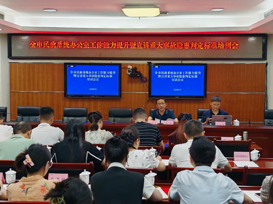 7月15日,遂宁市民政系统召开办公室工作能力提升暨宣讲重大事故隐患判定标准培训会议。市民政局党组成员、副局长彭军主持会议。