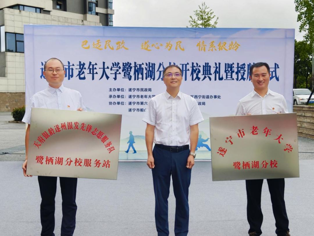 9月12日,遂宁市老年大学鹭栖湖分校开校典礼暨授牌仪式在船山区鹭栖湖社区举行。市民政局党组书记、局长赵维强,市民政局党组成员、副局长何德永,船山区委常委、组织部部长曾琪出席活动。
