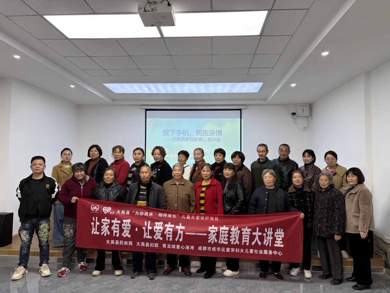 2025年11月2日,在大英县民政局指导下,爱芽社工在青龙坡村、福桥村开展“让家有爱·让爱有方”家庭教育大讲堂活动,本次活动特邀大英妇联、教育局2位家庭教育指导师,开展“放下手机,拥抱幸福”和“隔代教育爷爷奶奶的‘孙子兵法’”两场主题活动。
