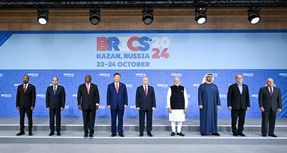 当地时间10月23日上午,金砖国家领导人第十六次会晤在喀山会展中心举行。俄罗斯总统普京主持会晤。中国国家主席习近平、巴西总统卢拉(线上)、埃及总统塞西、埃塞俄比亚总理阿比、印度总理莫迪、伊朗总统佩泽希齐扬、南非总统拉马福萨、阿联酋总统穆罕默德等出席。这是会晤期间,金砖国家领导人集体合影。新华社记者 李学仁 摄