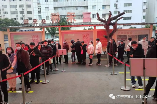 鉴于我省目前突发的疫情情况,为保障群众安全,我局提前对接区疫情防控指挥部,区卫健局和妇幼保健院,组织了10名医护人员前来支援,定时对大厅内进行消毒杀菌,并在门口设置体温检测点,严格执行体温检测、扫健康码、查看通行大数据行程卡、查验48小时内核酸检测报告等防控工作。船山区民政局组织机关干部及志愿者10余人,全程开展维护秩序、特殊导引(外地人员全程陪护)等相关服务。婚姻登记服务中心工作人员负责进行分批限量放行,对外地返遂人员引导至专办窗口,并做好隔离防护。