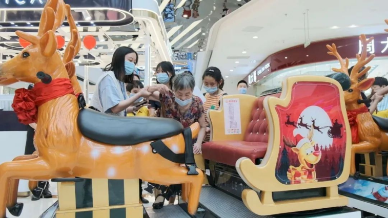 游玩的第一站是乘坐万达广场中庭的小火车。休养老人和特困“孩子”们第一眼就被造型可爱的小火车吸引,在志愿者的协助下,大家兴高采烈地坐上小火车,开启了万达广场的游玩之旅。