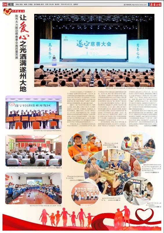 今年9月5日是第九个“中华慈善日”,今年主题是“崇德向善依法兴善”。近年来,遂宁将慈善事业高质量发展作为新时期民政工作的主抓手和总牵引,作为民政部门全面深化改革、推动共同富裕、助推乡村全面振兴的重要手段,着力推动“慈善+”“+慈善”,促进传统民政业务提能增效,助力城乡融合发展。