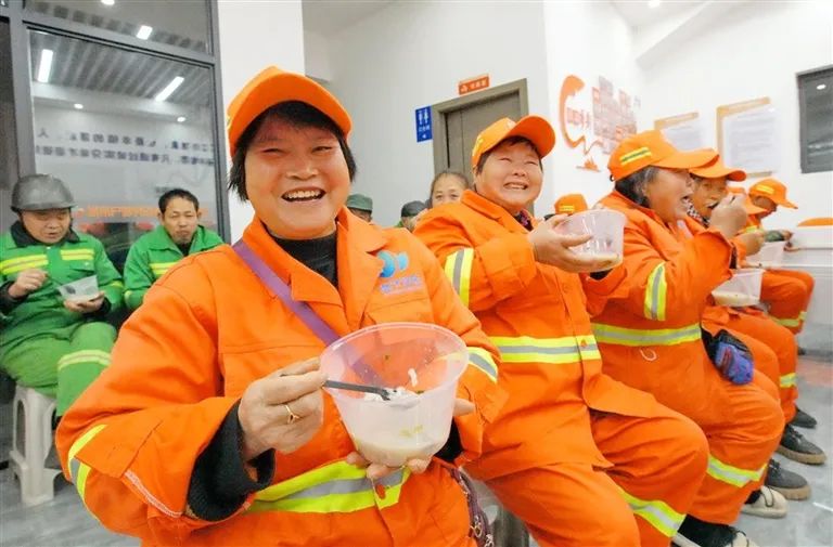 环卫工人在工会驿站喝到热腾腾的粥。首席记者 钟敏 摄