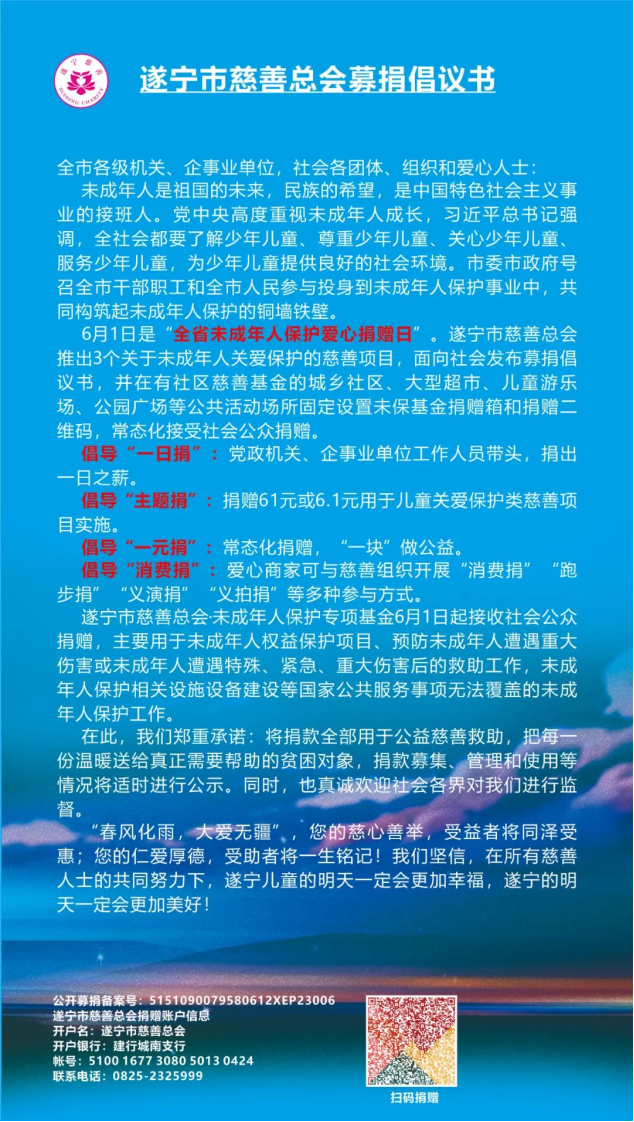 6月1日是“全省未成年人保护爱心捐赠日”。遂宁市慈善总会推出3个关于未成年人关爱保护的慈善项目,面向社会发布募捐倡议书,并在有社区慈善基金的城乡社区、大型超市、儿童游乐场、公园广场等公共活动场所固定设置未保基金捐赠箱和捐赠二维码,常态化接受社会公众捐赠。