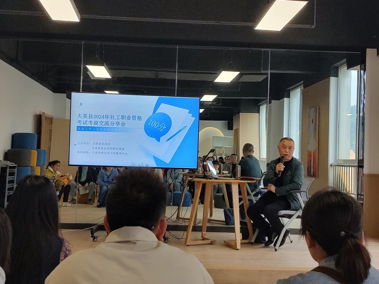 为开展社工人才队伍建设,提高社会工作者的专业服务水平,增强报考人员的自信心,提升学习效率及考试通过率,2024年4月8日,在大英县民政局指导下,大英启善社会工作服务中心在县社会组织孵化基地开展社工考前交流活动,本次活动共计50余人参加。