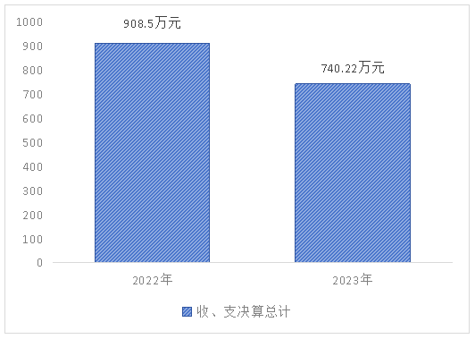 2023年度收、支总计均为740.22万元。与2022年度相比,收、支总计各减少168.28万元,下降18.52%。主要变动原因一是2023年相比于2022年无一次性支出项目,2022年市救助站新增外墙和污水整修一次性项目;二是2023年相比于2022年无社会福利的彩票公益金预算收入。