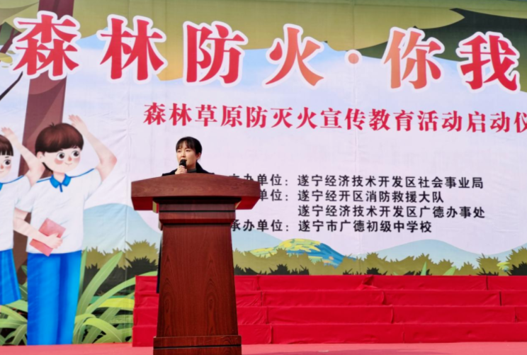 2月24日,“森林防火·你我同行”森林草原防灭火宣传教育活动启动仪式在广德中学举行,遂宁经开区社事局联合区消防救援大队、广德街道办事处、西宁卫生院相关人员以及区内各中小学分管安全的副校长、广德中学的全体师生1900余人参加启动仪式。
