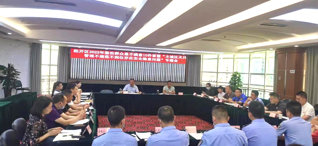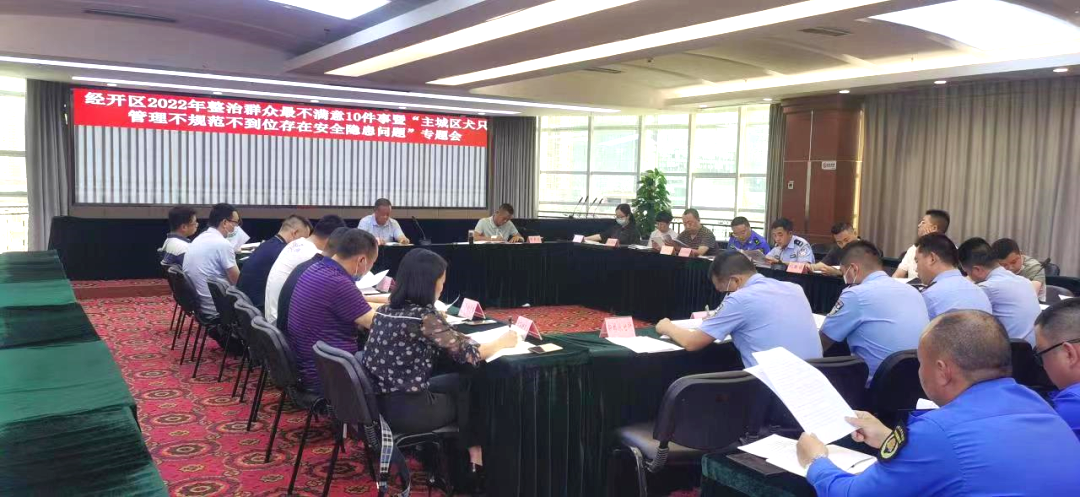5月10日下午,经开区组织召开2022年整治群众最不满意10件事暨“主城区犬只管理不规范不到位存在安全隐患”问题专题会议。区管委会副主任、公安分局局长王智斌,党工委委员、管委会副主任周春宏,管委会相关职能部门、各镇(街道)分管负责同志,分局治安大队、辖区各派出所所长参加会议。会议由周春宏副主任主持。